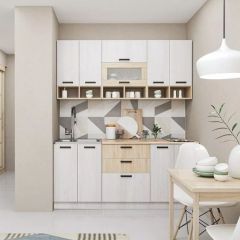 В дизайне кухонного гарнитура "Сорренто" используются текстуры светлого дерева - теплый насыщенный Дуб Сонома и белый Ясень Анкор Светлый. Компактные модули гарнитура позволяют рационально использовать пространство маленькой кухни.